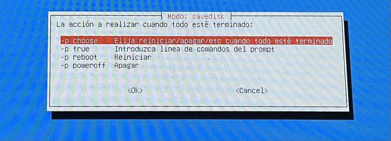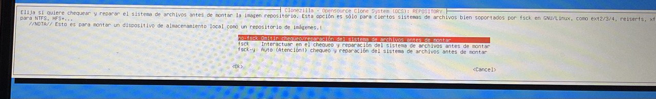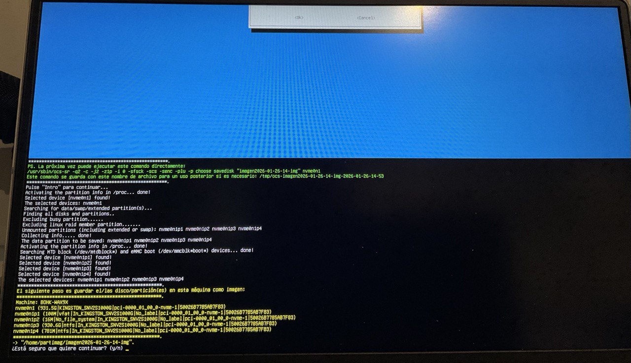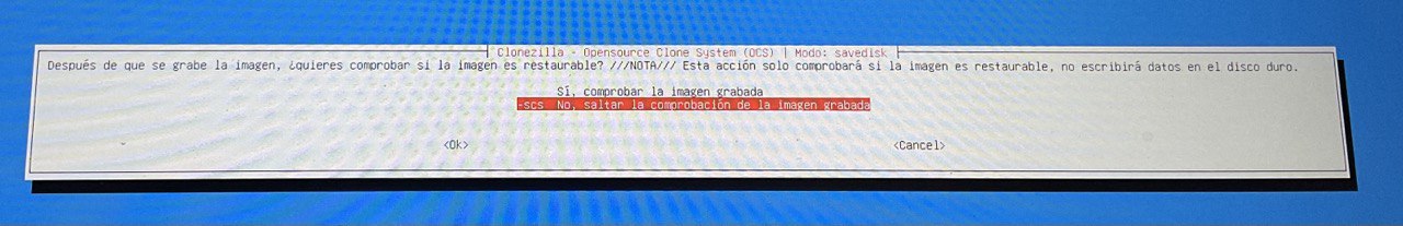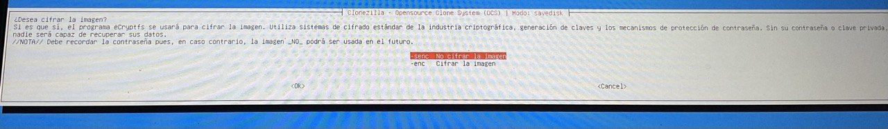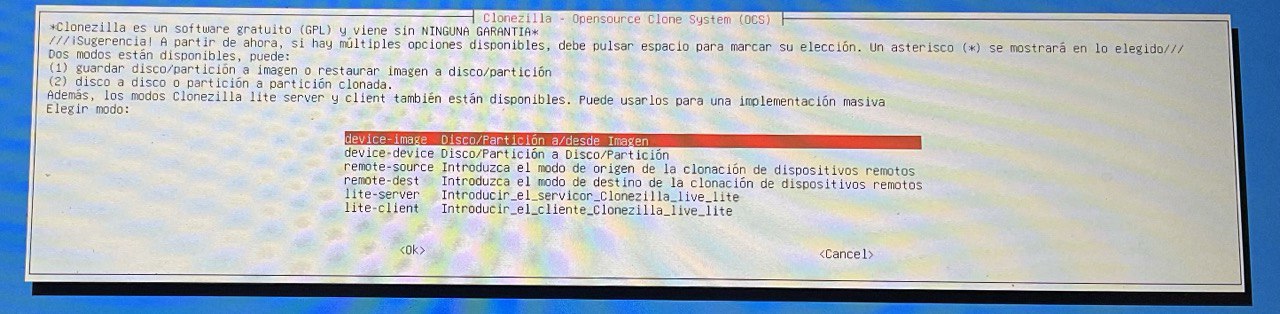 | Clonezilla es un software libre de recuperación de una imagen creada de un sistema operativo, tiene diversas funcionalidades como crear una imagen del sistema o eliminarla o por ejemplo eliminar una partición. 1. Descargar la aplicación clonezilla desde la página oficial (en formato *ISO). Página oficial – Descarga sourceforce – Descarga directa del la ISO para AMD64x 2. Instalar clonezilla en un USB (se pierde toda la información del USB) con el programa rufus Página oficial – Descargar rufus – Tutorial de como crear un disco de arranque en USB con clonezilla 3. Creación de la imagen con clonezilla Tutorial creación de imagen – 1 – Elegimos que queremos crear una copia de seguridad de un disco o una partición ![]() 2 – Seleccionamos donde guardarlo en un dispositivo local ![]() 3 – Ahora debemos seleccionar DONDE (en que disco duro) queremos que se guarde la IMAGEN ![]() 4 – Omitimos chequeo ![]() 5 – Seleccionamos «aquí mismo» raíz del disco duro donde se creará la imagen y damos a DONE ![]() 6 – Aceptaremos el «modo principiante» ![]() 7 – Guardaremos el disco como imagen ![]() 8 – nombráremos el archivo como queramos ![]() 9 – Ahora ELIGIREMOS EL DISCO DURO QUE QUEREMOS CLONAR (DONDE ESTA EL SO) ![]() 10 – Continuaremos el proceso ![]() ![]() ![]() ![]() ![]() ![]() ![]() 4. Restaurar la imagen creada con clonezilla Tutorial instalación de imagen. |