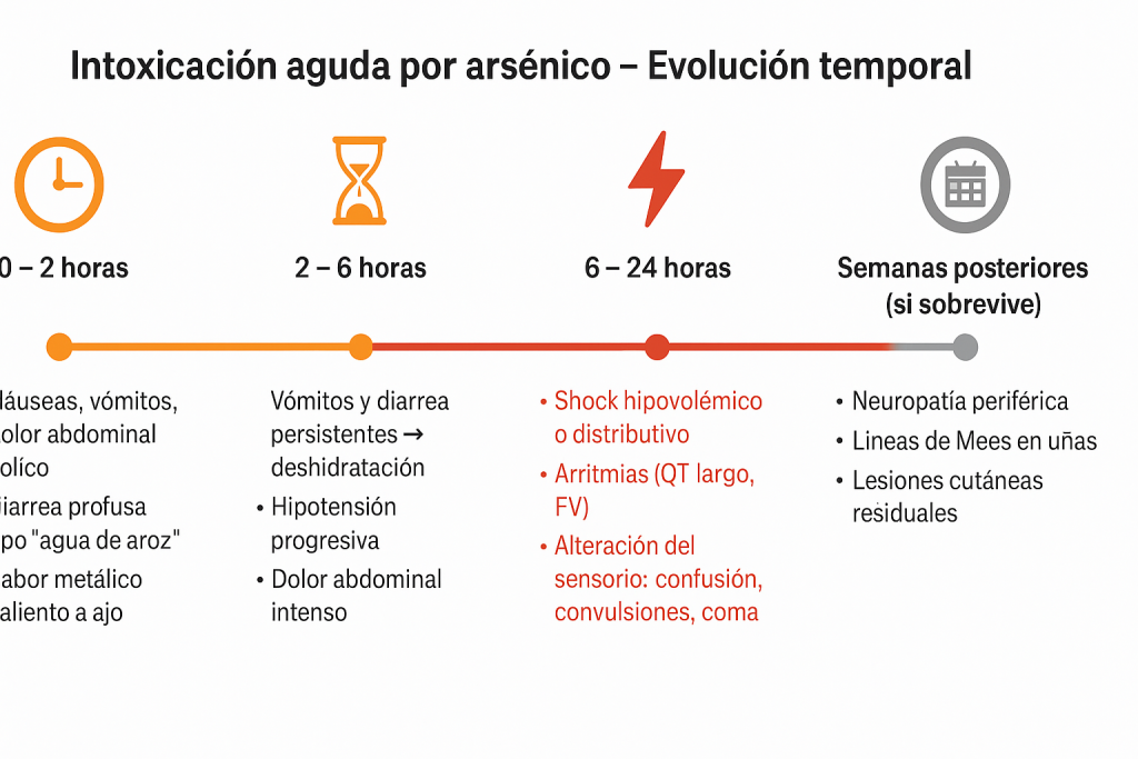 | En la intoxicación aguda por arsénico, los síntomas suelen aparecer rápidamente tras la exposición. Los síntomas suelen comenzar en la primera hora, casi siempre antes de las 2 horas posteriores a la exposición. Los síntomas digestivos aparecen en la primera hora, rápidamente seguidos de colapso cardiovascular y, si el paciente sobrevive, evolucionan a fallo multiorgánico en 24–72 horas. Línea temporal de la intoxicación aguda por arsénico 0 – 2 horas (fase inicial): Síntomas gastrointestinales Náuseas intensas, vómitos. Dolor abdominal cólico. Diarrea acuosa abundante («agua de arroz»). Sensación de sabor metálico o aliento con olor a ajo (característico). 2 – 6 horas (fase gastrointestinal + inicio sistémico): Síntomas digestivos e hipotensión arterial Diarrea cada vez más profusa, a veces sanguinolenta. Vómitos persistentes con riesgo de deshidratación. Dolor abdominal severo. Hipotensión progresiva por pérdidas hídricas y vasodilatación. 6 – 24 horas (fase cardiovascular y neurológica) Shock hipovolémico y/o distributivo. Arritmias (QT largo, fibrilación ventricular). Cefalea, mareo, alteración del nivel de conciencia. Convulsiones o coma en intoxicaciones graves. 1 – 3 días (fase multiorgánica) Insuficiencia renal aguda (necrosis tubular). Acidosis metabólica grave. Insuficiencia respiratoria (edema pulmonar, distrés respiratorio). Pancitopenia y hemólisis. Días – semanas posteriores (en sobrevivientes) Neuropatía periférica sensitivo-motora. Líneas de Mees en las uñas. Lesiones cutáneas residuales. |
