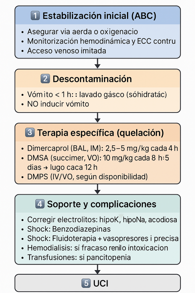 | El tratamiento de la intoxicación aguda por arsénico debe iniciarse de forma inmediata, ya que la mortalidad es elevada si no se actúa rápido. Se basa en: 1. Medidas generales de soporte – Estabilización inicial (ABC): asegurar vía aérea, oxigenación y estabilidad hemodinámica. – Monitorización: constantes vitales, ECG continuo (riesgo de arritmias por QT largo). – Corrección hidroelectrolítica: reposición intensiva de líquidos y electrolitos (Na, K, Cl). – Tratamiento de la acidosis metabólica: con bicarbonato IV si es grave. 2. Descontaminación – Si ingestión reciente (<1 hora): lavado gástrico (sólo si paciente consciente o vía aérea protegida). – Carbón activado: poco eficaz para arsénico, pero puede administrarse si la ingesta fue mixta con otros tóxicos. – No se recomienda inducción de vómito. 3. Quelantes específicos (tratamiento clave) Los antídotos son los agentes quelantes con grupos sulfhidrilo que se unen al arsénico, formando complejos estables que se eliminan por orina: * Dimercaprol (BAL, British Anti-Lewisite): 2,5–5 mg/kg IM cada 4 horas (primeras 2 días), luego cada 6–12 h según evolución. Es el antídoto clásico, muy eficaz. Esquema clásico de administración: Primeros 2 días: 2,5–5 mg/kg IM cada 4 h. Días 3–10: la frecuencia se va espaciando progresivamente (cada 6–12 h). Duración total: 7–10 días, ajustando según evolución clínica y niveles de arsénico. * Dimercaptosuccínico (DMSA, succímero): Oral, alternativa más segura en intoxicaciones menos graves o tras estabilización (útil tras fase aguda o en casos moderados.). Dosis: 10 mg/kg cada 8 h durante 5 días, luego cada 12 h. Esquema clásico de administración: 10 mg/kg cada 8 h durante 5 días, luego cada 12 h por 14 días adicionales. Duración típica: 2–3 semanas. * Dimercaptopropanosulfonato (DMPS): Oral o IV, más seguro y eficaz que BAL, disponible en algunos países. Similar a DMSA pero con mejor tolerancia. Duración: 1–2 semanas, ajustada según respuesta clínica y excreción urinaria. 4. Medidas adicionales – Hemodiálisis: útil para insuficiencia renal aguda o si se usó dimercaprol (BAL) con arsénico libre circulante, ya que mejora la eliminación. – Transfusiones en casos de hemólisis o pancitopenia grave. – Tratamiento de convulsiones: con benzodiacepinas. – Soporte multiorgánico en UCI en casos graves. |