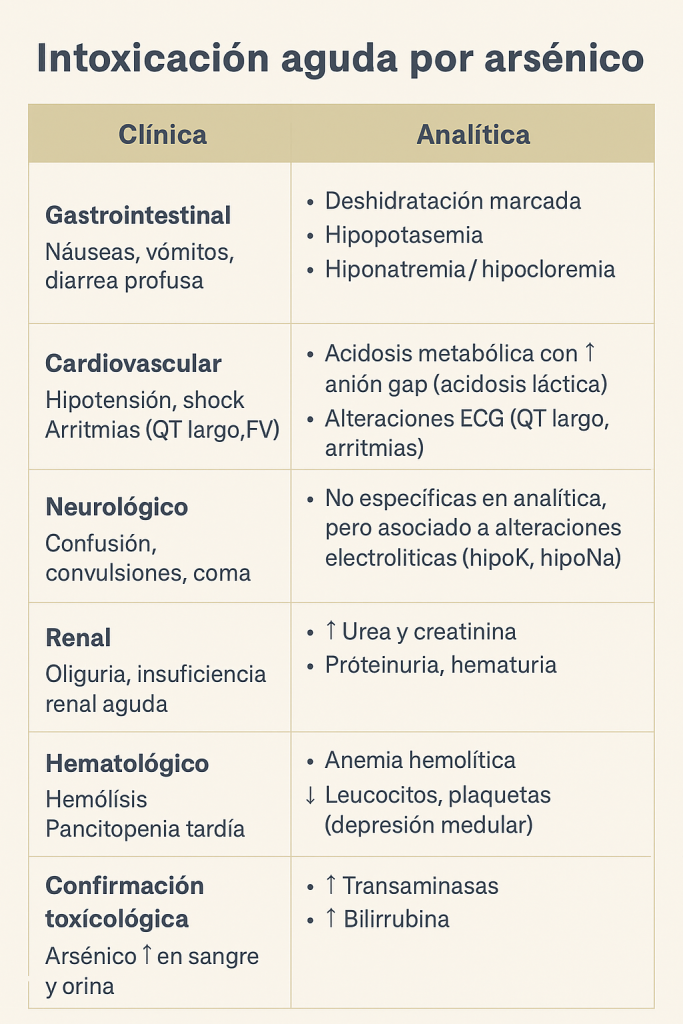 | Se esperan alteraciones hidroelectrolíticas, acidosis metabólica, fallo renal, depresión medular y, de forma confirmatoria, niveles elevados de arsénico en sangre y orina. 1. Electrolitos y equilibrio ácido–base – Hipopotasemia (pérdidas digestivas masivas). – Hiponatremia / hipocloremia. – Acidosis metabólica con aumento del anión gap (por hipoperfusión tisular y acidosis láctica). 2. Función renal – Elevación de urea y creatinina → insuficiencia renal aguda (necrosis tubular). – Proteinuria y hematuria ocasional. 3. Hematológicas – Leucocitosis inicial. – Pancitopenia progresiva (depresión medular). – Hemólisis intravascular en algunos casos. 4. Hepáticas – Elevación de transaminasas. – Hiperbilirrubinemia. 5. Cardíacas – Alteraciones en ECG: QT largo, arritmias ventriculares. – Aumento de troponinas en casos graves por daño miocárdico. 6. Específicas: Arsénico en sangre y orina: – En intoxicación aguda, los niveles urinarios suelen estar muy elevados (> 50 µg/L). – La orina de 24 horas es la prueba de confirmación más sensible. |