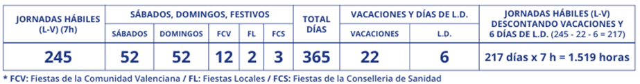| – Las guardias realizadas los siguientes días festivos “ESPECIALES: 1 ENERO, 6 ENERO, 9 OCTUBRE, 25 DICIEMBRE:” se tratarán como domingo dando derecho a 1 día más de vacaciones que restará jornada del total de las 1589 horas. – Las guardias en festivos “ESPECIALES: 1 ENERO, 6 ENERO, 24 DICIEMBRE, 25 DICIEMBRE, 31 DICIEMBRE” se retribuyen el doble que una guardia laboral. |