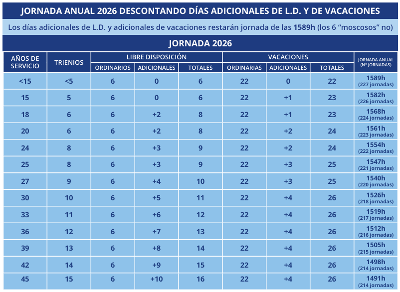 | Para personal de institución sanitarias, tanto FIJO como INTERINO. Se genera el derecho en el mismo año que se cumple un nuevo trienio o un año de antigüedad. Se disfrutará a partir del día siguiente al cumplimiento. (Cálculo proporcional al tiempo trabajado). DÍAS ADICIONALES DE LIBRE DISPOSICION POR TRIENIOS: – Al cumplir 6º trienio: 2 días de Libre Disposición más. – A partir del 8º: 1 día más por cada trienio. * Todos los que correspondan se disfrutarán en 2026 hasta el 15 de enero 2027. DÍAS ADICIONALES DE VACACIONES POR ANTIGÜEDAD – Al cumplir 15 años de antigüedad: 1 día extra de vacaciones (23 días) – Al cumplir 20 años de antigüedad: 20 años: 2 días extra de vacaciones (24 días) – Al cumplir 25 años de antigüedad: 3 días extra de vacaciones (25 días) – Al cumplir 30 años de antigüedad: 4 días extra de vacaciones (26 días) |