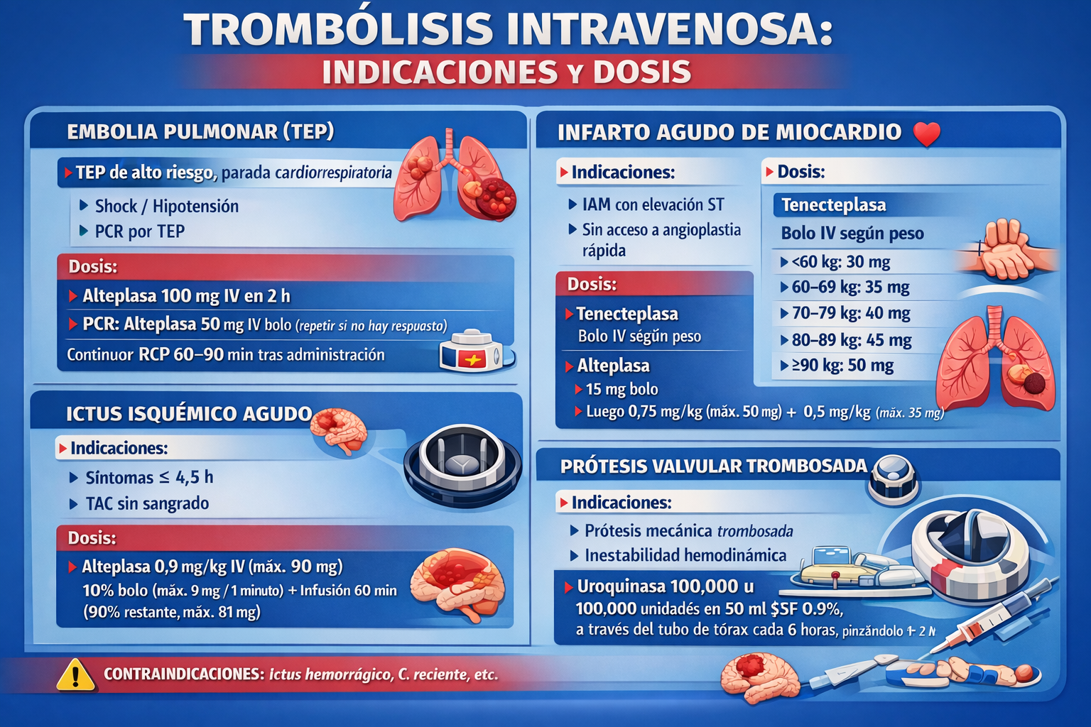En esta sección encontrarás un resumen práctico y actualizado de las principales indicaciones, fármacos y dosis de trombólisis, diseñado como material de apoyo clínico y docente para profesionales sanitarios. El objetivo es ofrecer una visión clara, estructurada y fácilmente consultable en escenarios donde el tiempo y la precisión son críticos.